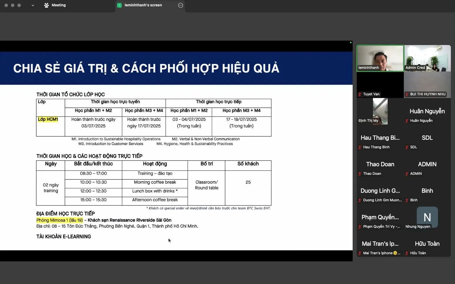 Ngoài thời gian học trực tuyến trên hệ thống LMS do trung tâm công nghệ của trường đại học EHL vận hành và quản lý, các học viên sẽ tham gia các buổi học trực tiếp để chia sẻ ứng dụng thực tiễn cùng với các đào tạo viên dày dặn kinh nghiệm, đã được EHL cấp chứng nhận đào tạo viên cho chương trình Swiss EHT.